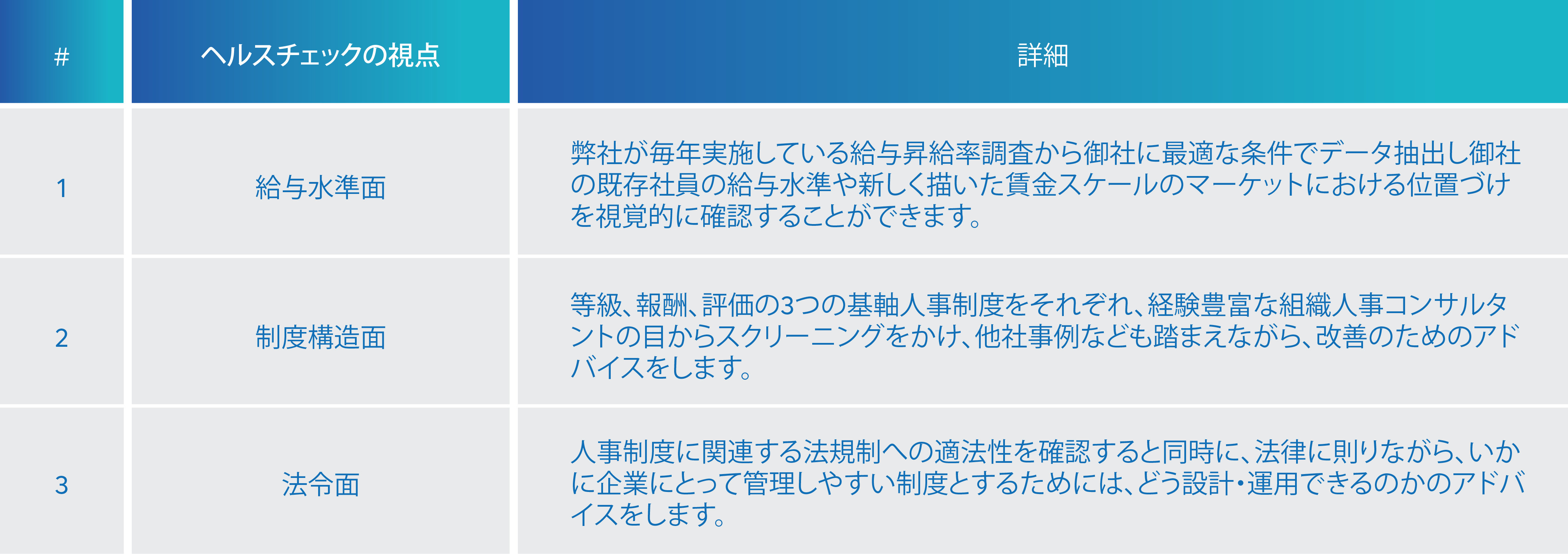 「⼈事制度は⾃社で設計したいが、現状の⼈事制度のどこに課題感があるのかプロの⽬線でチェックをしてほしい。」