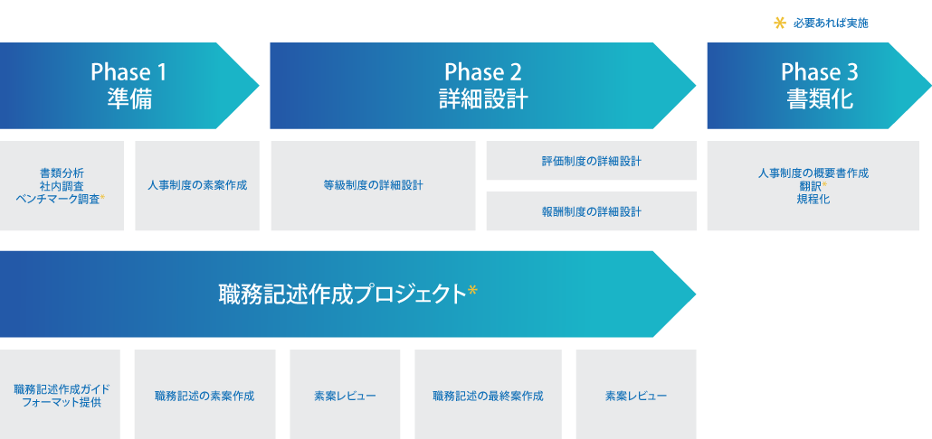職務記述の具備がなされていない企業様の場合、職務記述作成プロジェクトを同時並⾏にて進めるケースもあります。